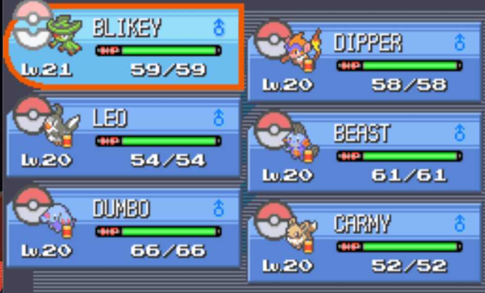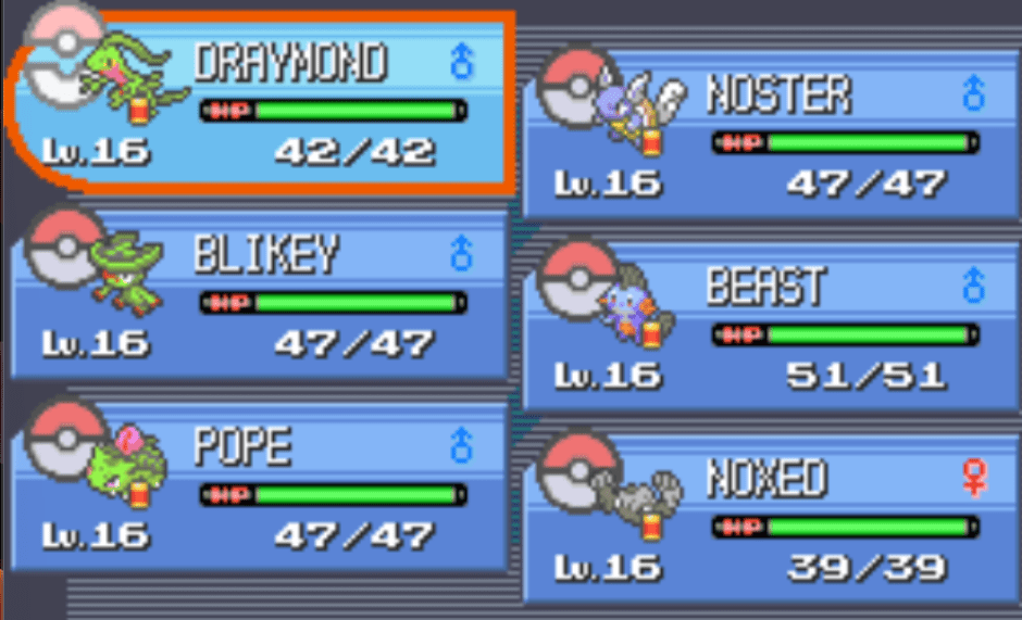 With a level cap of 16, I craft our team carefully, aiming for the ultimate blend of Water, Grass, and Rock power. After some intense training, Blikey evolves into a formidable Lombre, Noster transforms into a Wartortle, Beast becomes a bulky Marshtomp, Draymond into a nimble Grovyle, and Pope turns into the fierce Ivysaur. Roark stands in our path, his Rock-type team ready to throw down with Nosepass, Bonsly, Geodude, Onix, Larvitar, and Cranidos. Knowing Nosepass might lead with Electric moves and set up for residual damage, we counter by opening with Draymond.